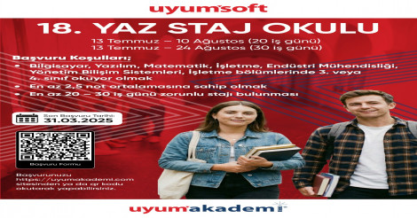 Bu sene 18.sini yapmaya hazırlandığımız Uyumsoft Yaz Staj Okulu için kayıtlar başladı! 13 Temmuz - 10 Ağustos (20 iş günü)/ 13 Temmuz 24 Ağustos(30 İş gün